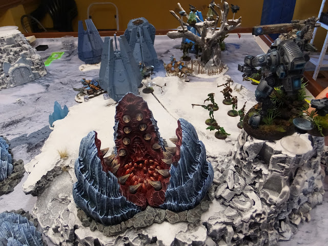 Панцирь сделал под холодную, замерзшую землю, а камни вокруг не стал покрывать снегом, чтобы монстра можно было использовать на других столах.